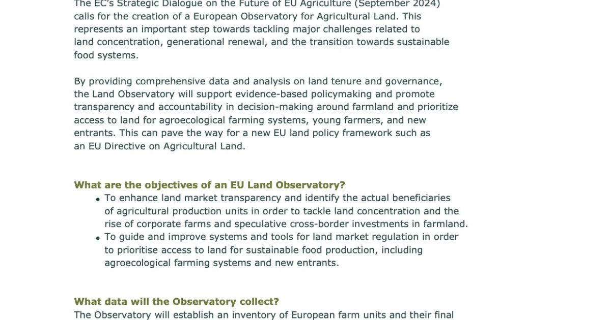 By providing comprehensive data and analysis on land tenure and governance, the Land Observatory will support evidence-based policymaking and promote transparency and accountability in decision-making around farmland and prioritize access to land for agroecological farming systems, young farmers, and new entrants. This can pave the way for a new EU land policy framework such as an EU Directive on Agricultural Land.