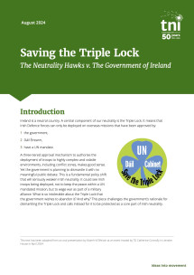 A three-tiered approval mechanism to authorise the deployment of troops to highly complex and volatile environments, including conflict zones, makes good sense. Yet the government is planning to dismantle it with no meaningful public debate. This is a fundamental policy shift that will seriously weaken Irish neutrality. It could see Irish troops being deployed, not to keep the peace within a UN mandated mission, but to wage war as part of a military alliance. What is so intolerable about the Triple Lock that the government wishes to abandon it? And why? This piece challenges the government’s rationale for dismantling the Triple Lock and calls instead for it to be protected as a core part of Irish neutrality.